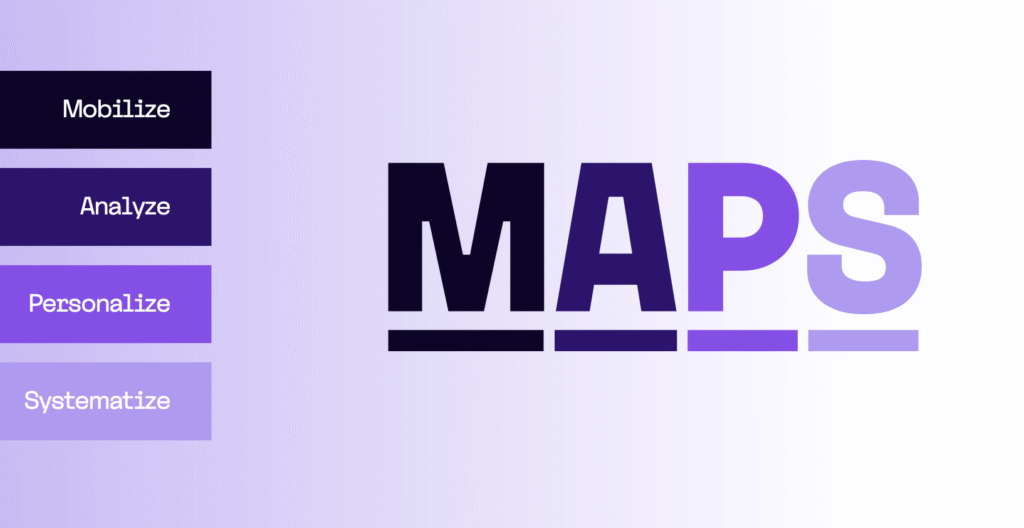 The M.A.P.S. Framework™ (Mobilize, Analyze, Personalize, Systematize) is a proprietary, business-first methodology designed to help medium and large enterprises (500+ employees, $100M+ in revenue) successfully adopt, scale, and monetize AI initiatives. Unlike most approaches that leave organizations stuck in pilot purgatory, MAPS provides a structured roadmap that tackles the root causes of AI failure—unclear business objectives, poor data quality, lack of integration, cultural resistance, and weak executive sponsorship. By aligning strategy with measurable KPIs, securing C-suite ownership, building strong data foundations, personalizing solutions to the business context, and institutionalizing AI through governance and MLOps, MAPS ensures AI becomes a sustainable engine for ROI and competitive advantage, not just another experiment.